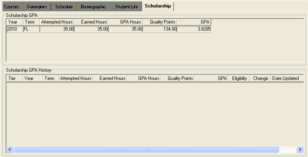 The Scholarship tab on the Student Inquiry window has two group boxes: Scholarship GPA and Scholarship GPA History.