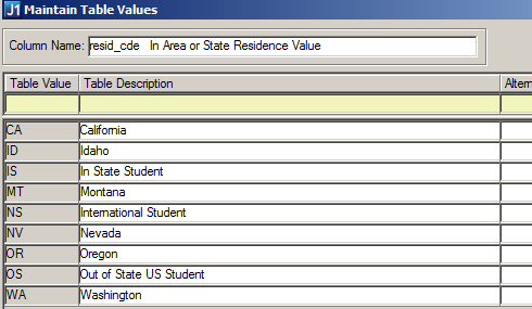 1. Define areas appropriate for your school in the Maintain Table Values window with the Column Name of "resid_cde."