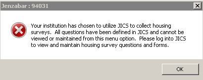 Your institution may define survey questions in campus portal (JICS). If so, this Question Definition window is not available to you. The following message is displayed: