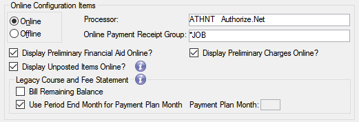 Two options are provided for handling online payments submitted via JICS: online processing or offline processing. The type of processor your organization chooses to use determines the way payments are handled. Jenzabar currently provides by default several online credit card processors along with the authorization codes for each. Your organization can choose to use one of the default processors, or you can choose to use your own processor. Your organization must establish an account with the processor in order to be able to generate credit card authorizations.