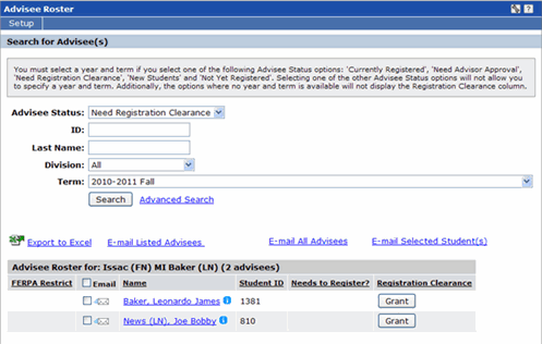 2. The Advisee Roster displays a column labeled "Registration Clearance."