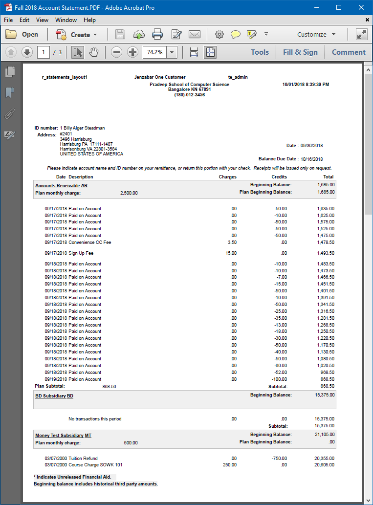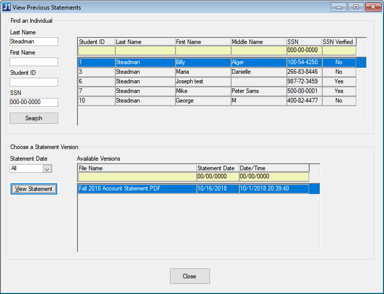 Use this window to view any previously run student account statement for a specific student. Example