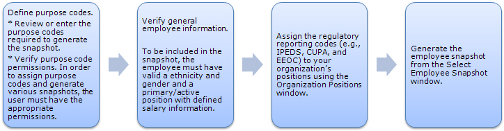 · Purpose Type which describes the purpose and is used to create the Purpose Code (e.g., HR IPEDS) · Purpose Code which defines why the information is being collected for the snapshot (e.g., 2010 IPEDS) · Employee with the following · Biographical master data (i.e., valid ethnicity and gender) · A primary or active position with defined salary information · Position start and salary review dates before the Snapshot As of Date and the position end date after the Snapshot As of Date |