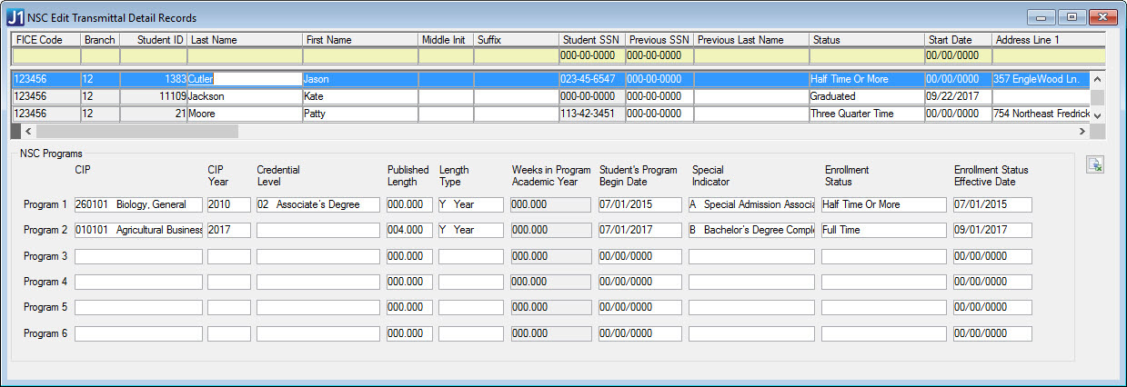 Students' program information is captured on the NSC Edit Transmittal Detail Records window. It acts as an NSC enrollment reporting tool. For up to six programs, you can view and edit these columns: