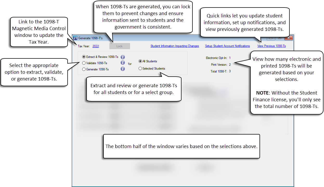 * If you do not have a license for Student Finance, some features on the 1098-T window may not be available to you.