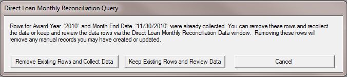The Collect Direct Loan Reconciliation Data window calculates the DL disbursement data needed to meet the requirements of the Business Office Disbursement Reconciliation external update process in PowerFAIDS and populates the Direct Loan Report table based on these calculations.