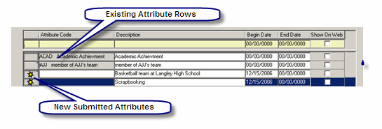 Submitted Attribute rows are displayed below the existing Attribute rows in the same grid. A sunburst icon is displayed beside the new Attribute rows so that they can be quickly identified. Submitted Attribute rows can be deleted from this window if you determine that the information is a duplication of an existing row.