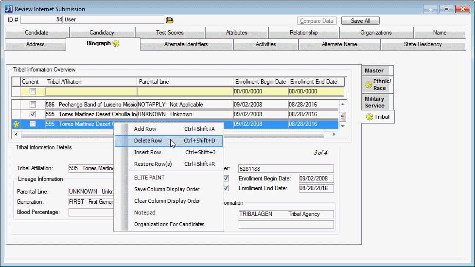 6. To enter more than one tribal affiliation, right-click a row in the Tribal Information Overview data window, and select Add Row. Follow the same steps above and click the Save button on the main toolbar.