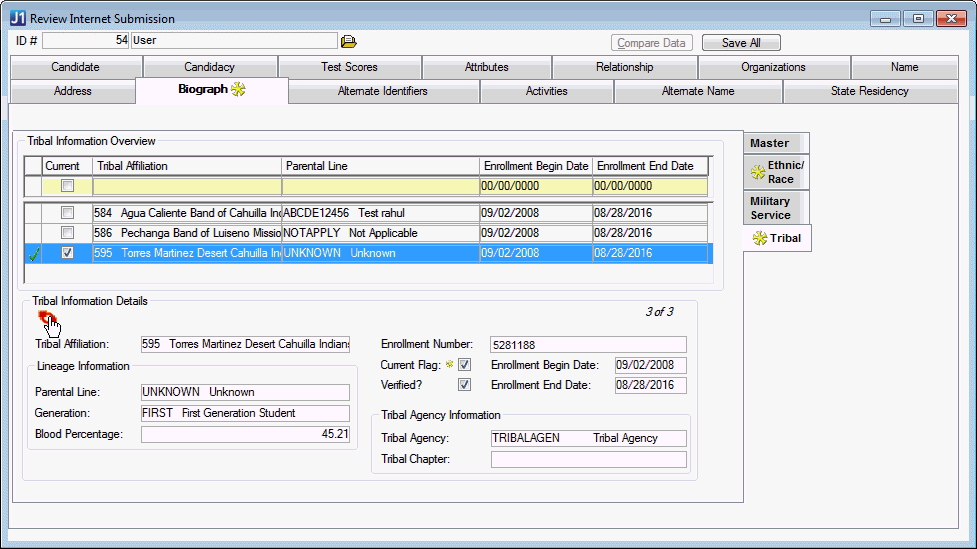 When the submitted data row is selected, the submitted values will appear in the Tribal Information Details box.