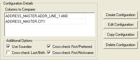 This group box contains the Columns to Compare list, Soundex and Cross-Check check boxes, and configuration buttons.