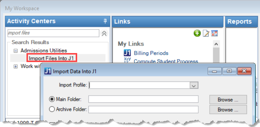 Workspace navigation wording for this window is "Import Files Into J1" and the window name is "Import Data Into J1." When navigating to this window from the Workspace, search for "Import Files Into J1." Example |