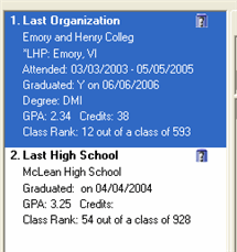 The Submitted Organization Info can display the following submitted information (read only) for the organization: submitted organization type and code, the appropriate status icon, name, assigned ID Number, address, start and end date information, graduation information, degree information, GPA/credit information, and class size/rank information. Example. This information comes from questions mapped to the Organization Tracking logical mapping table. Each row mapped to the Organization Tracking table contains data entered by the user. If the Last High School column for a particular mapping is set to 'Y', the grouping has a "Last High School" header. If the Last Organization column = 'Y', the heading is "Last Organization". Any other organization has a header of "Other Organization".