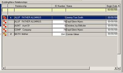 The following existing relationship information in the J1 database is displayed in the Existing/New Relationships grid: assign/unassign icons, associated relationship row number, relationship code/description, ID Number, name, begin date, end date, attitudes, notes, and corresponding relationship notations. You can update any rows displayed in this grid. Example