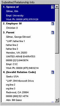 The Submitted Relationship Info pane displays the following submitted information (read only) for the related person/organization: relationship row number, relationship, the appropriate status icon, name, ID Number, address, phone information, employer information, work phone information, and (optionally) the organization contact name. Example. It may also display e-mail information, biographical information, and additional relationship information. The submitted information comes from questions mapped to the RELATED_PERSON logical mapping table. Each row mapped to the RELATED_PERSON table contains data entered by the user and is displayed as a separate grouping with the specified relationship displayed at the top of each grouping. If the relationship code specified in the form does not exist in the RELATIONSHIP_DEF table, "(Invalid Relation Code)" is displayed instead of the relationship description.