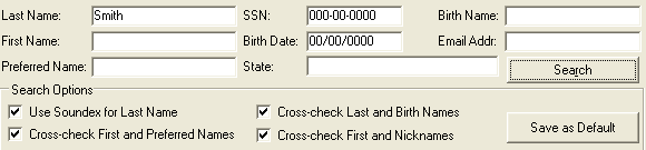 If you made changes to your search options and want to save these changes, you can update your current settings in User Preferences by clicking the Save as Default button. The next time you open the Name Search window, the Search Options will be displayed as you last saved them. However, none of the entered search criteria values are saved; therefore, you must enter search criteria values each time the Name Search window opens.