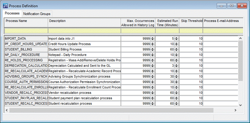 To view the most current list of processes available for scheduling, open the Process Definition window. You can also use this window to change the description of the process and associate the process owner's e-mail address.