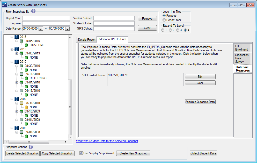 h. Select the years/terms that should be used to determine if the student is still enrolled, and click the Populate Outcome Data button.