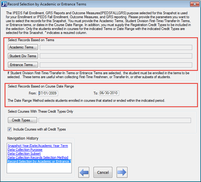 d. You must use the date range, or select all years and terms for Record Selection. (You must choose one or the other; you can't use more than one method.)