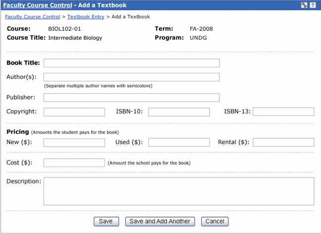 This checkbox allows you to indicate whether textbook entry will be allowed in the Faculty Course Control portlet in campus portal (JICS). The checkbox is selected by default. Clear this checkbox if you do not want to allow textbook entry via this portlet.