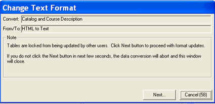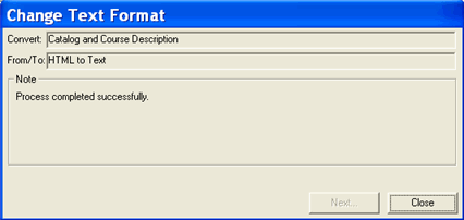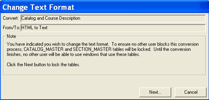 · When a different text format is selected, data in the CATALOG_MASTER.CATALOG_TEXT and SECTION_MASTER.COURSE_TEXT tables are converted to the newly selected text format. The Note in the Change Text Format window alerts you to this conversion.