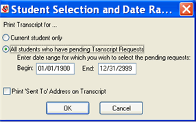 1. If multiple transcript requests exist when you click the Print Transcripts button on the Transcript Requests window, the Student Selection and Date Range popup window is displayed.
