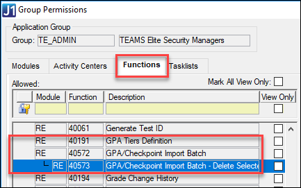 in the Group Permissions window | Functions tab | RE GPA/Checkpoint