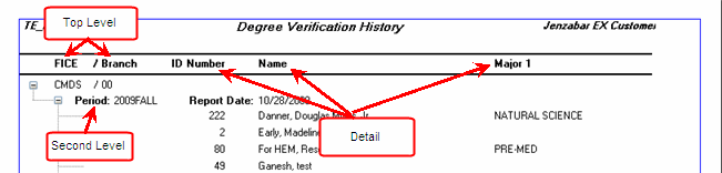 The Report drop-down displays a list of reports from rereports.pbl with name like r_nsc_deg_verification_hist. The Original report, which can be customized, is displayed as a tree-view report with the FICE/Branch as the top level and Periods (with Report Date) as the second level. It then displays student ID, Name, and Major 1 columns as detail.