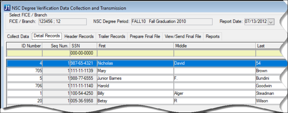 On the Detail Records tab, verify the information. You can remove or add students as necessary. The fields are editable, so you can make changes, but the changes are for the report only. They don't apply to the student master database table.