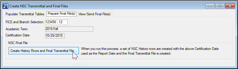 Use the Create NSC Transmittal and Final Files window | Prepare Final Files tab to update the NSLC_TRANS_HISTORY table and create the Final Transmittal .txt file you'll upload to NSC. This process creates a set of NSC History rows. The Certification Date you select is used as the Report date.