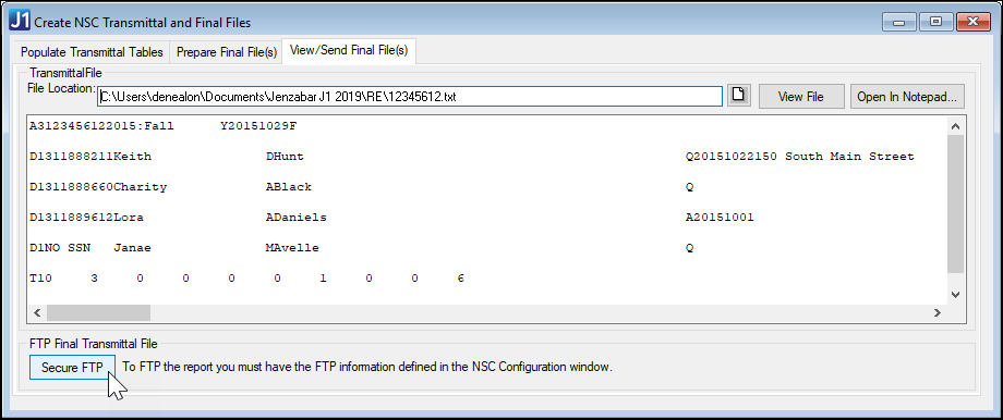 Before you click the Secure FTP button, make sure WinSCP is installed, and make sure your firewall is not blocking it. Jenzabar's FTP process requires you to use the WinSCP software from Standard Networks to facilitate uploading to the NSC Secure FTP site. To download and install WinSCP , go to https://winscp.net/eng/download.php. |