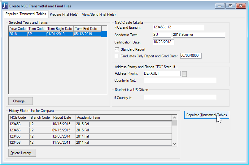 The Populate Transmittal Tables process finds all students enrolled in the selected year/term by looking at the NSLC_REG_TRANSACT table (NSC Edit Registration Transactions window).