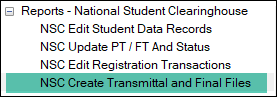 | Part-Time/ Full-Time | Go to the NSC Update PT/FT Hours and Status Information window to update part-time full-time status. | PFN-NSCSTS: NSC Enrollment Status if your school doesn't use RBU for NSC PT/FT definition (Registration Configuration window | Registration Configuration tab) | The Create NSC Transmittal and Final Files window uses this to populate the NSC transmittal tables. |
