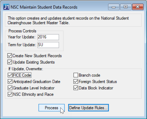 | Required | These rules run automatically when a student is created, and you can rerun them in the NSC Maintain Student Data Records window. | NS1: FICE Code NS2: Branch Code NS4: Foreign Student Status NS5: Graduate Level NS6: Data Block NS11: Racial/Ethnic |