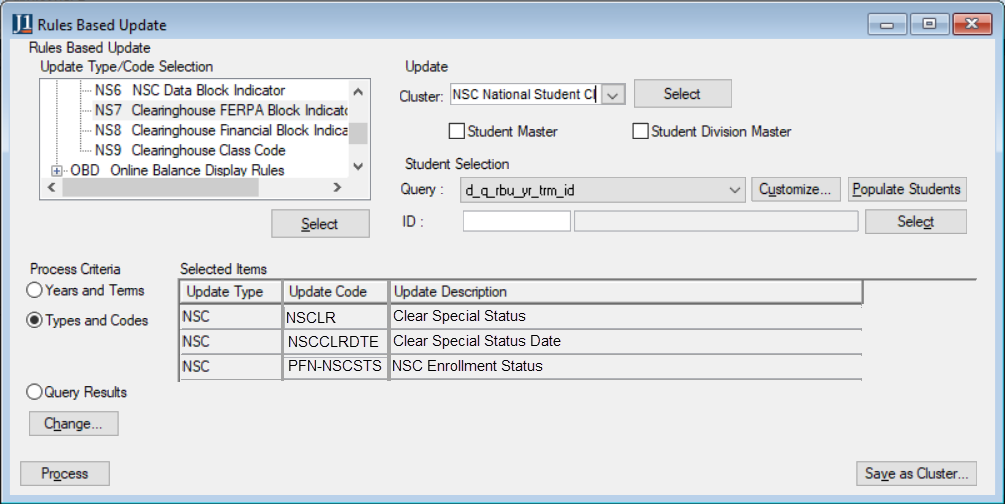Select Update existing Students, and select all the checkboxes under it to run the required RBUs.