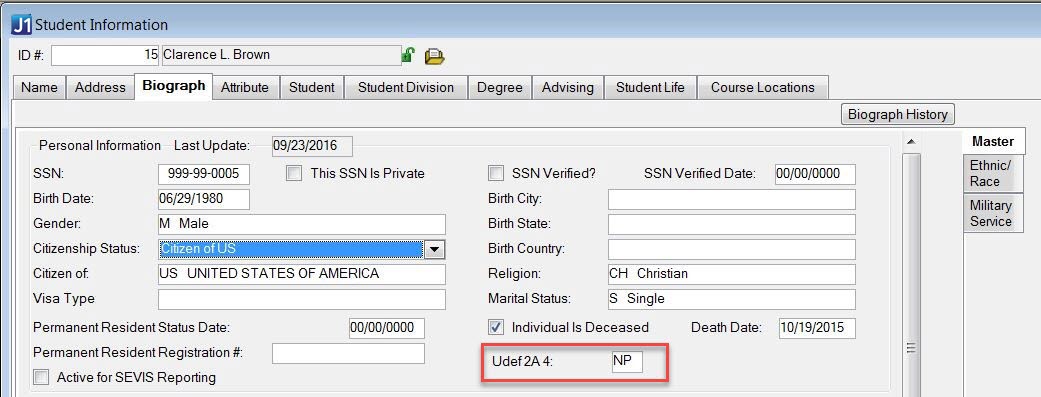 In the example below, ELITE PAINT was used to display BIOGRAPH_MASTER.UDEF_2a_4 on the Student Information window to store an additional value.