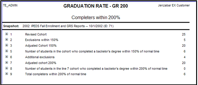 When you select a Part for the Form and Snapshot selected in the header, the data is retrieved and displayed on the Report tab. In some cases, the report allows you to drill down to the ID Numbers and names. You can also customize the report and/or print the report. A Print All Parts button allows you to print all of the parts for the IPEDS report selected in the Regulatory Forms drop-down list.
