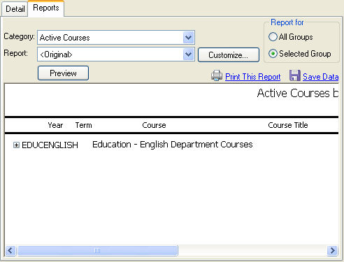 To generate a report, first use the Category drop-down list box to determine if you want to view a report of Active Courses or of Groups & Members. Then select whether the report will be for All Groups or the Selected Group. You can use the original Report, use a customized report (where available) or click the customize button to edit the default report in InfoMaker.