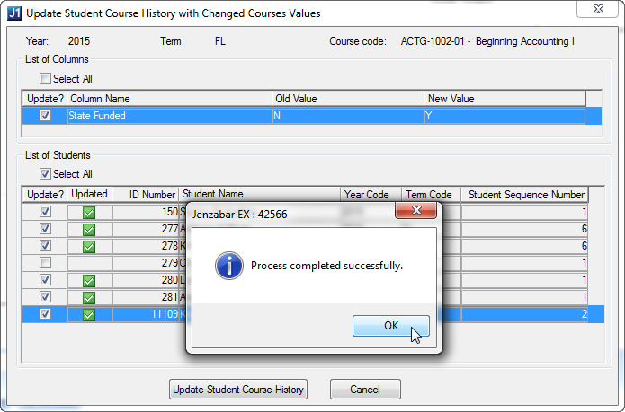 You can select which records will receive the update. If you have made multiple changes before the save, you can select which changes to process, too. If you press Cancel on the Update Student Course History with Changed Course Values window, you will have an opportunity to choose between saving your changes without updating any student course histories, or to exit without saving your changes.
