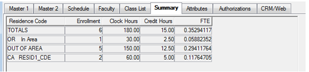 The Summary tab of the Courses window allows you to see the number of students in a specific course from geographical areas you define and assign to students. This data comes from SECTION_SUM_V. In addition to viewing the data on a course-by-course basis, you may want to develop reports for the Year and Term to display credit hours or clock hours for each of the areas.